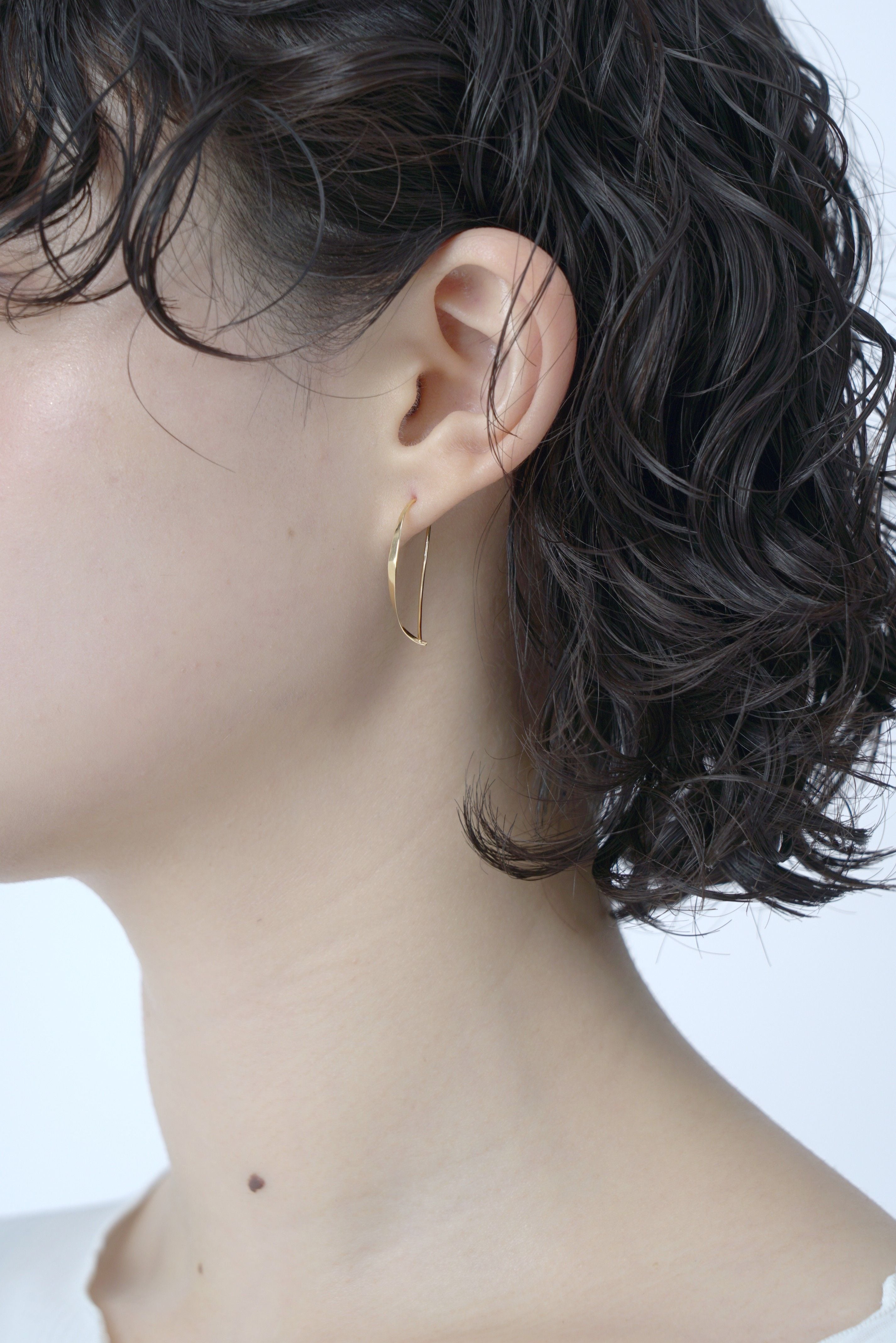 ゆるやかなカーブラインとK18イエローゴールドの煌めきが美しいこのピアスは、まるで着けているのを忘れるほどの軽やかな着け心地。